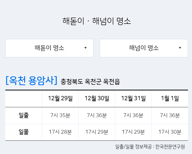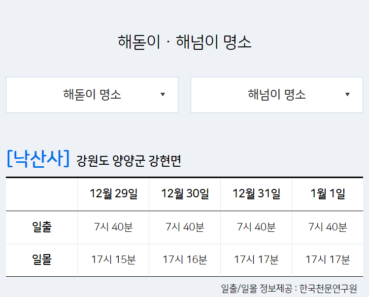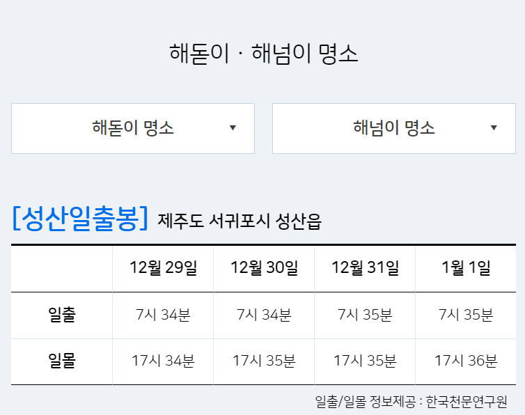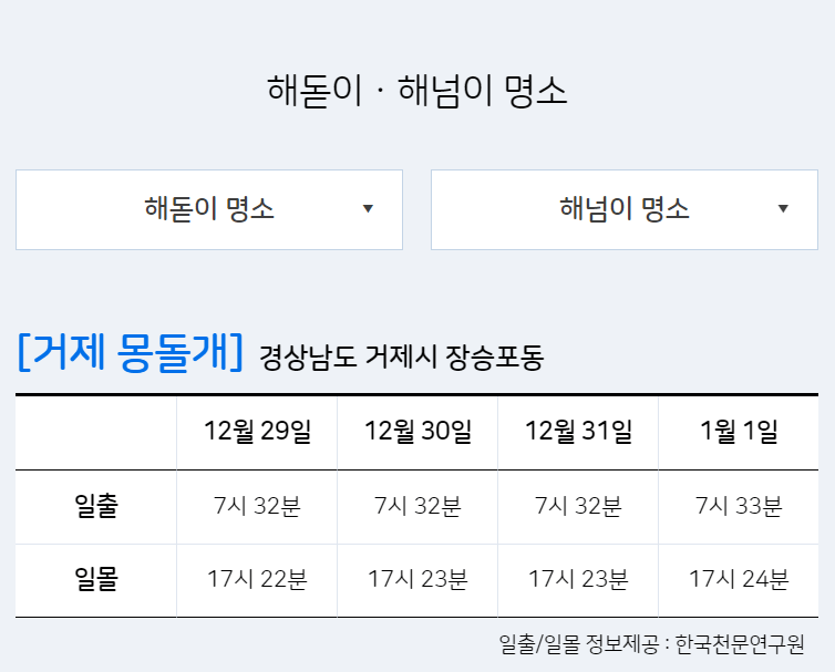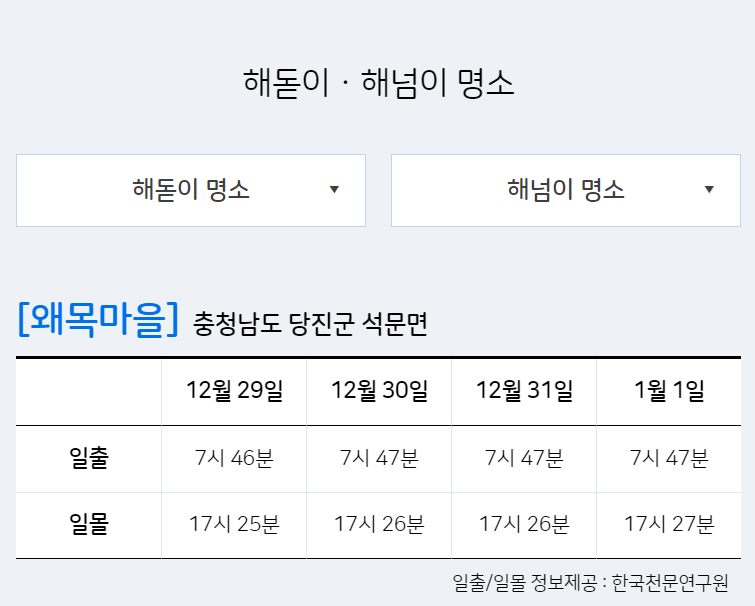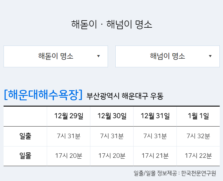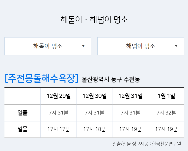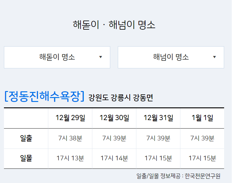 다른 해돋이/일출 명소를 알고 싶다 하실 때는 기상청 사이트를 이용하시면 조금 더 편하시지 않을까 합니다.