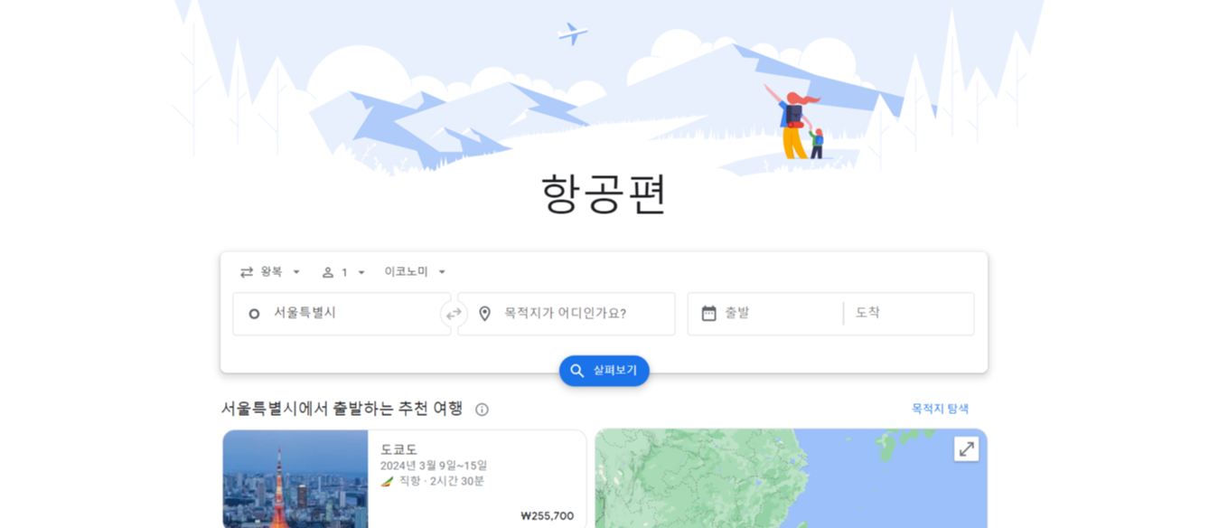 3대 항공권 검색엔진 중 하나인 구글플라이트의 최대 장점은 가격변동을 빠르게 확인할 수 있다는 점입니다. 구글플라이트 사이트는 아래 그림과 같습니다.