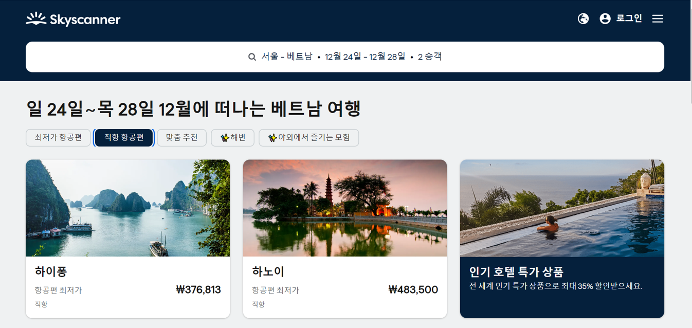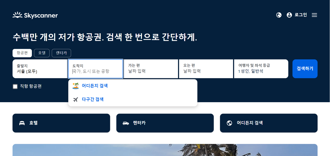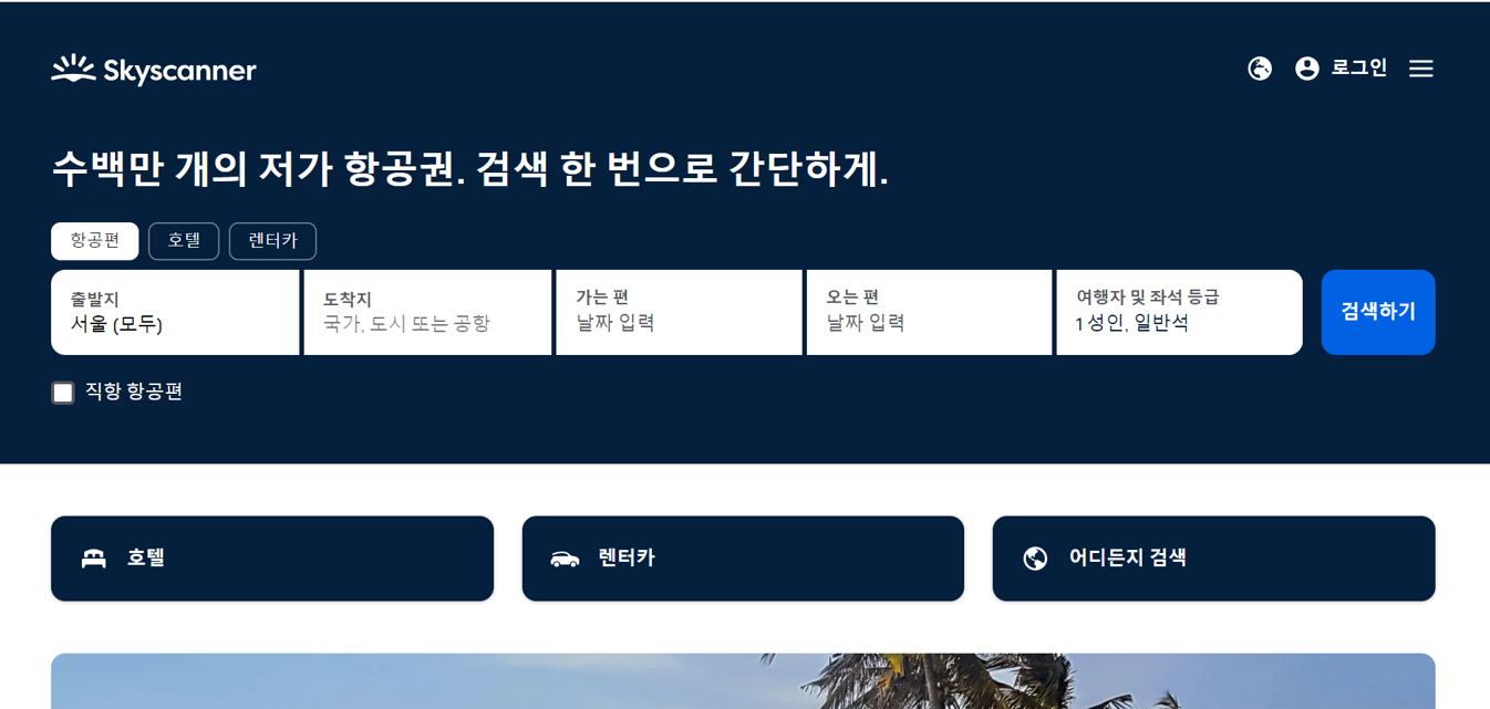 3대 항공권 검색 엔진 (카약, 구글플라이트, 스카이스캐너)중 하나인 스카이스캐너입니다.