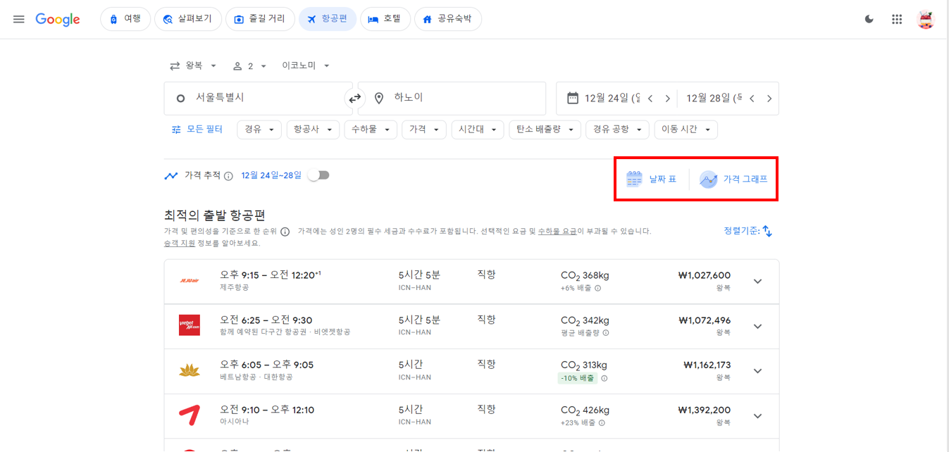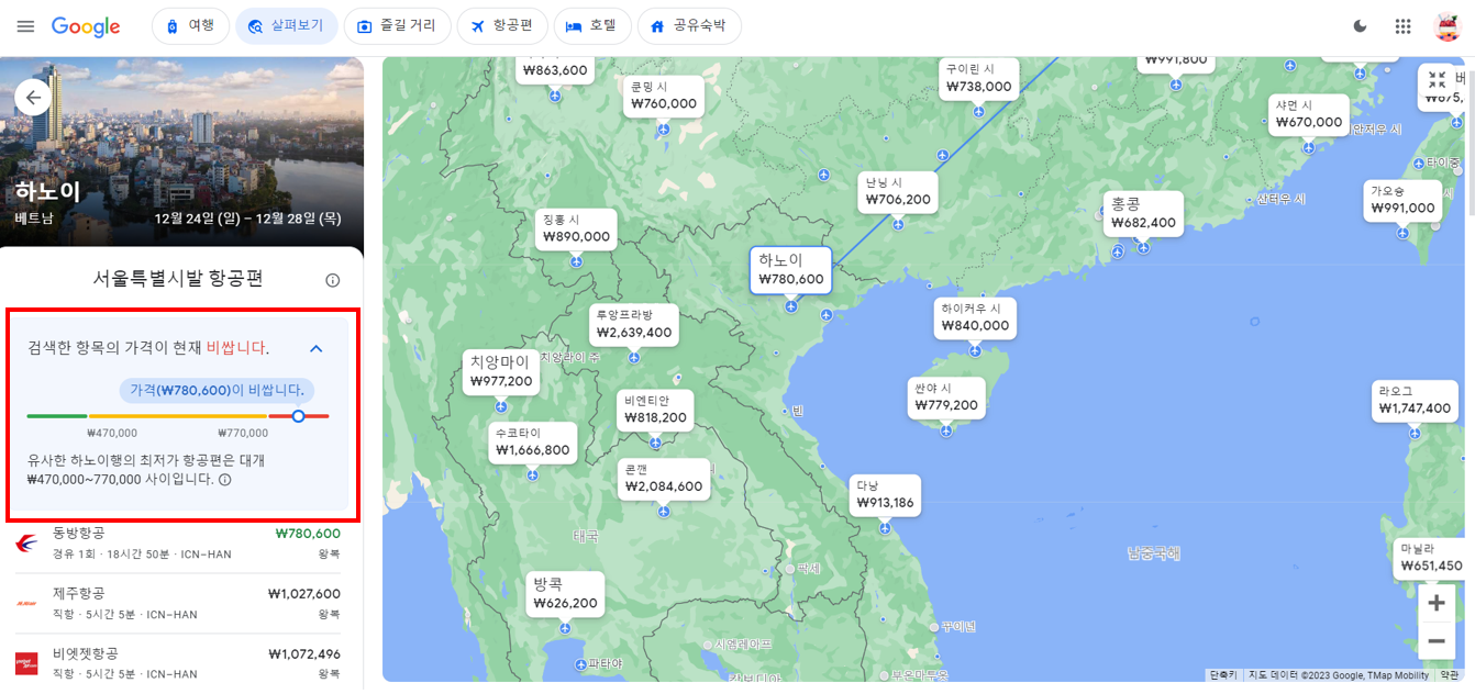 구글 플라이트의 최대 장점은 실시간 가격이 비싼지와 가격시세가 어떻게 변했는지 쉽게 확인할 수 있다는 점입니다. 아까 스카이스캐너와 동일한 하노이를 검색해보도록 하겠습니다. 감사하게도 빨간색 창으로 표시드린 것처럼 지금 가격은 비싼 편이라고 알림을 줍니다.