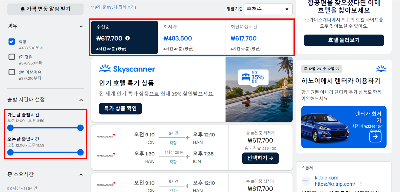 또한 아래 그림처럼 추천순, 최저가순 등으로 검색할 수 있으며, 항공사 선택이나 출발시간 선택으로 선택폭을 다양하게 가져가 검색할 수 있습니다.