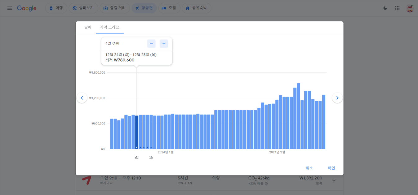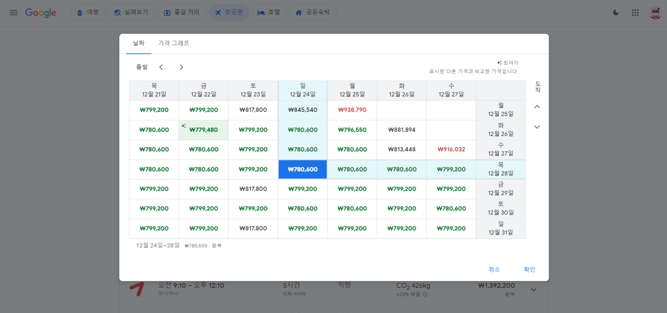 날짜 표와 가격 그래프를 클릭하면 아래 그림과 같이 나타나며, 날짜 표에서는 가장 저렴한 가격의 항공권을 제시하기도 합니다.