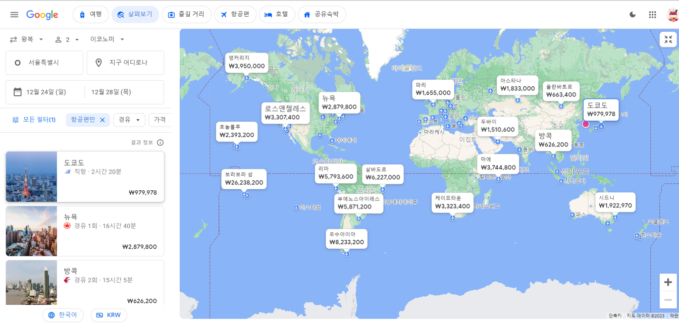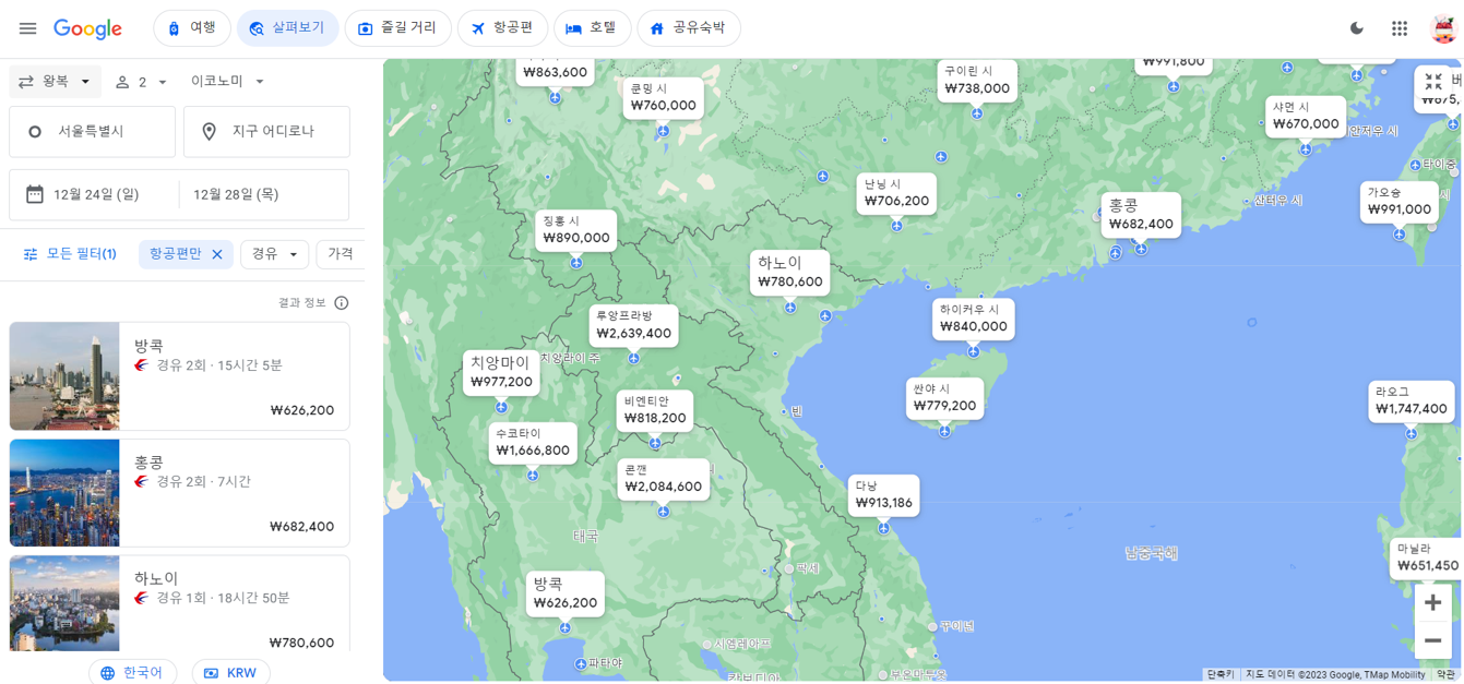 검색을 진행하면 아래와 같이 지도와 리스트가 같이 표현됩니다. 개인적으로 깔금하게 보기에는 스카이스캐너, 자세하게 보기에는 구글플라이트가 좋은 것 같습니다.