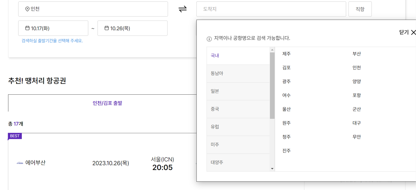 해당 링크에 들어가시면 아래 그림처럼 땡처리 항공권이라는 페이지로 넘어가게 됩니다.