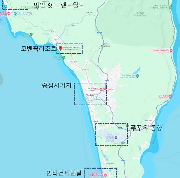 제가 모벤픽을 추천드리는 이유는 고급리조트와 풀빌라를 보유한 복합리조트이기때문입니다. 보통 무료픽드랍서비를 보유한 호텔은 그렇게 많지 않습니다. 대부분 푸꾸옥 비행기가 새벽에 도착함을 봤을 때, 무료픽업서비스가 있고, 30분 전후로 도착할 수 있는 호텔을 선정하는 것이 좋다고 판단했습니다. 저는 5박 6일 일정이었기에 처음 2박은 새벽비행기로의 피로를 풀고 주변관광을 목적으로 숙소를 결정한 것도 모벤픽을 선정한 사유입니다. 아래 그림을 보시면 아시겠지만, 공항을 기점으로 모벤픽과 인터컨티넨탈의 위치가 유사하고, 중심시가지에서도 가까운 편인 점을 알 수 있습니다.