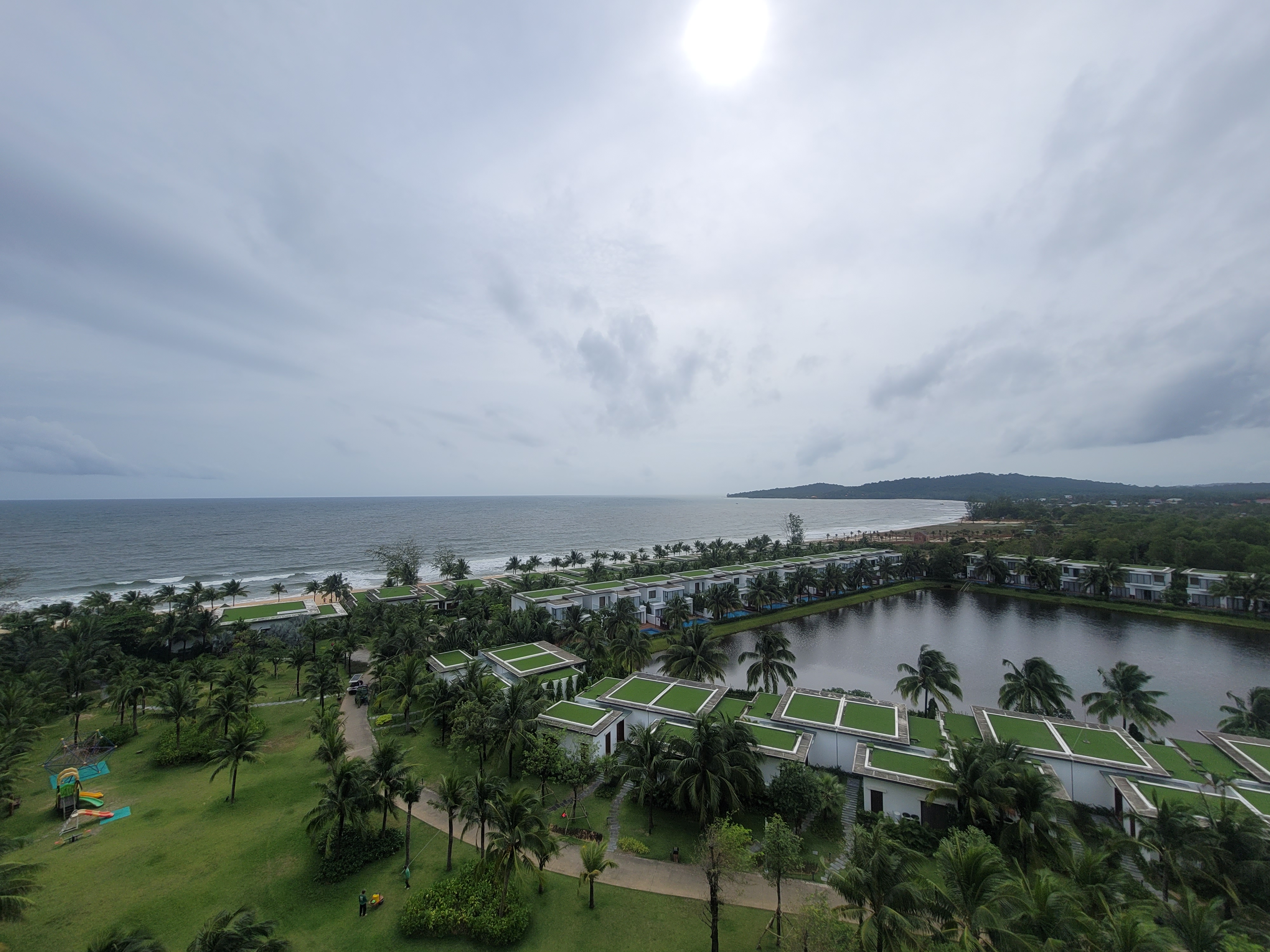 숙소에서 바라본 리조트 풍경입니다. 앞에 보이는 게 풀빌라고, 풀빌라들은 개개 수영장을 갖고 있습니다. 제가 묵은 리조트에도 1층은 개개 수영장을 포함한 숙소였습니다. 아래 보시면 잔디밭에 아이들이 놀 수 있는 놀이터도 있습니다. 해가 있으면 너무 더워서 해가 조금 가려진 날씨가 덥지도 않아서 놀기에는 더 좋았습니다.