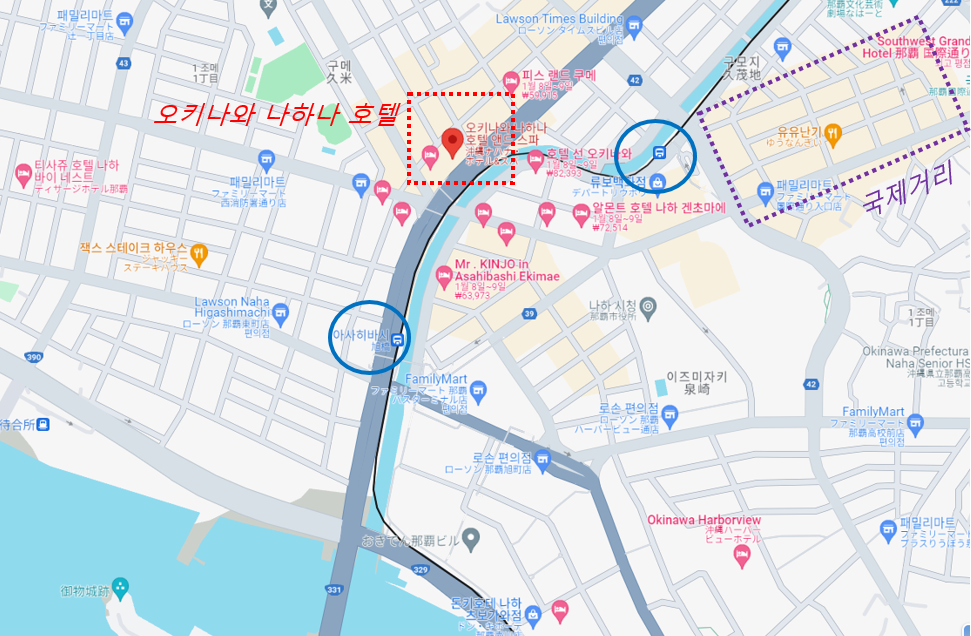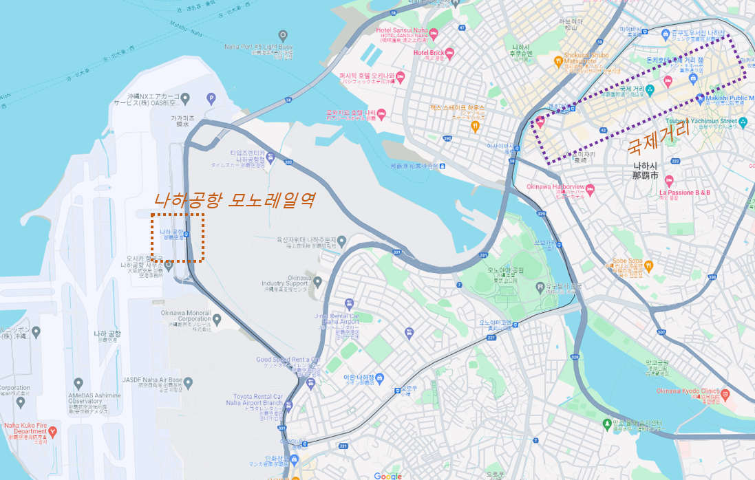 아래 지도와 같이 나하공항 모노레일역에서 국제거리가 있는 곳까지 20여분이면 충분히 도착합니다.