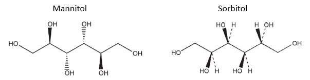 만니톨은 소르비톨 (Sorbitol)의 이성질체입니다. 구조를 보시면 아시겠지만, 닮은 구조를 가지고 있으며 분자량도 동일합니다. 만니톨과 소르비톨은 쓰임새가 비슷하면서도 조금 다른 경향이 있습니다. 특히나 소르비톨은 안정화제나 보습제로도 사용하고 있습니다.